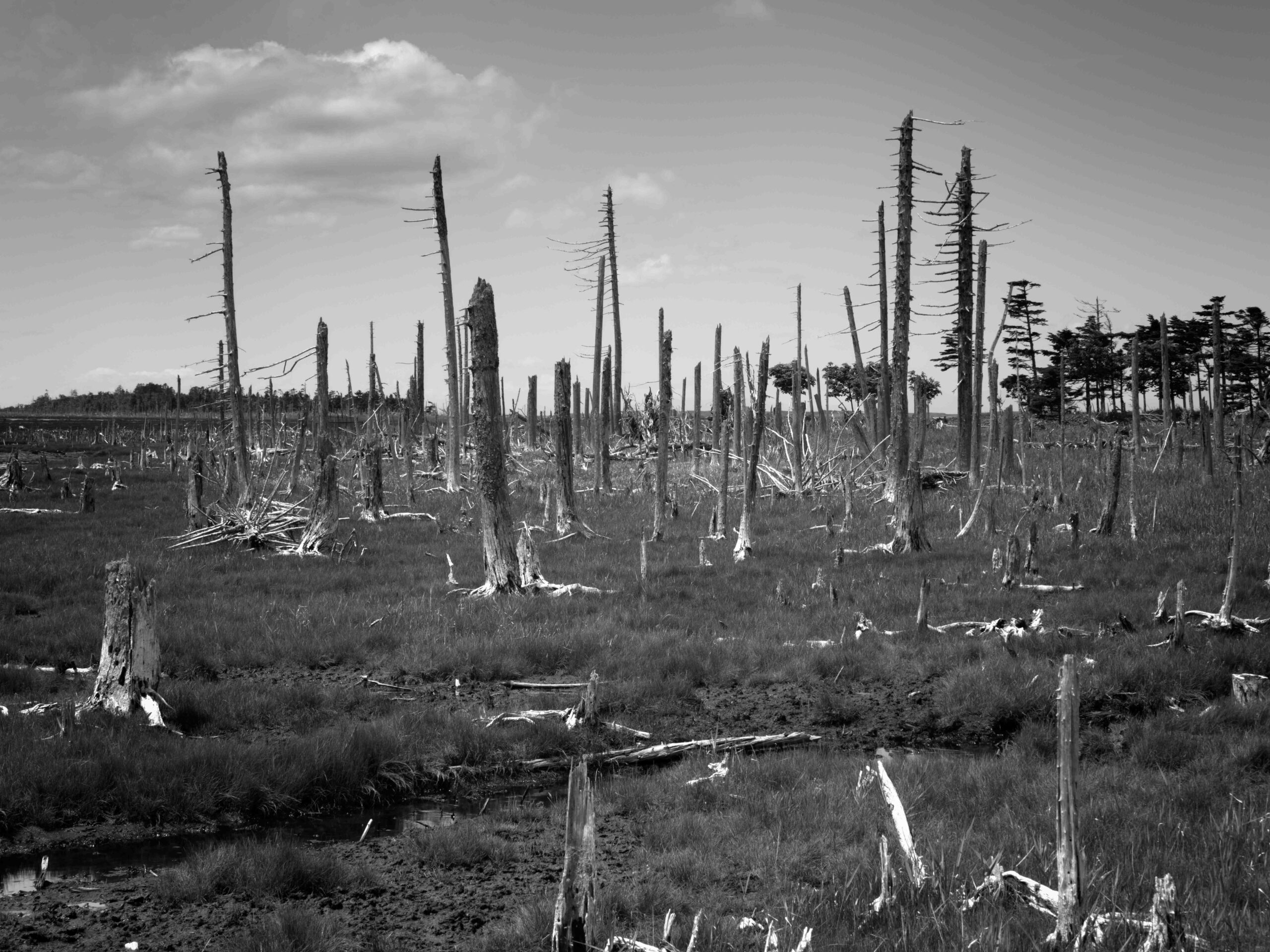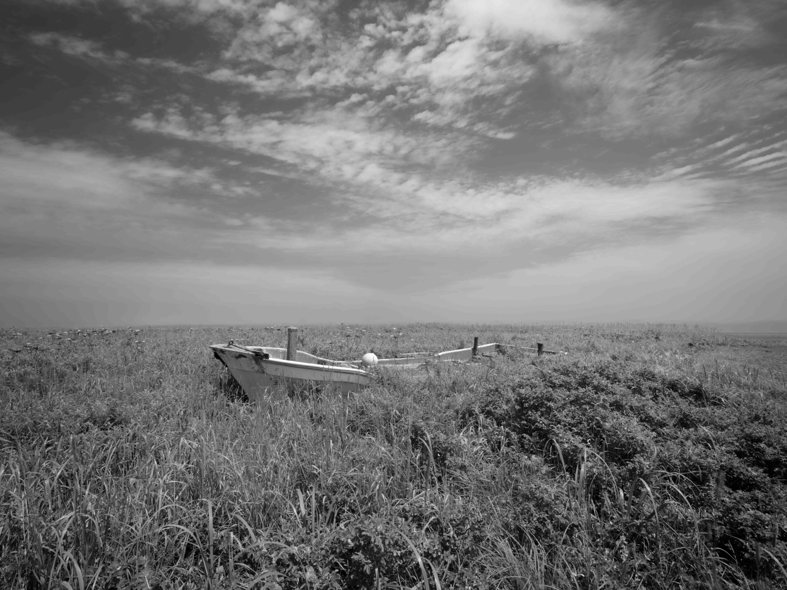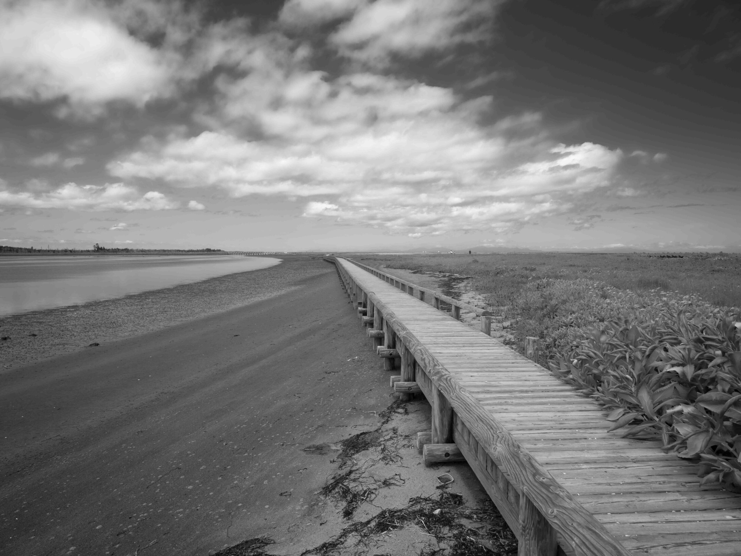 風蓮湖は根室半島のつけ根に位置し、周囲約96kmの海水の混ざる汽水湖です。 野付風蓮道立自然公園の中にあり、広大な湿原や森林、砂丘など変化に富んだ自然環境が広がっています。 風蓮湖と根室湾を区切るように、長さ8km、幅1.3kmの長大な砂州が春国岱です(根室市観光協会のHPより)20年以上前より仕事の関係もあり、道東地区を毎年訪れていましたが、この風蓮湖は「季節により」「天候により」「潮の満ち引き」によりその表情を大きく変えることに気づき、それ以降機会があるごとに訪れています。今回はそれらを伝えたく、カメラを持ってきました。季節は夏、天候は晴れで引き潮です。